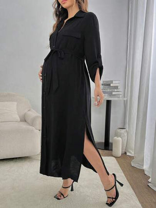 فستان قميص كاجوال طويل بأكمام مطوية وبلون سادة للنساء الحوامل، مناسب للربيع والخريف ، للحمل