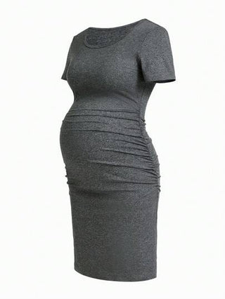 فستان كاجوال للنساء الحوامل بقصة رقبة مستديرة وأكمام قصيرة بتصميم بسيط مكسرات ذو لون أحادي، مناسب للحمل