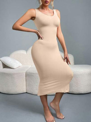 فستان محكم طويل ذا رقبة طاقم لون أحادي للنساء، بدون أكمام