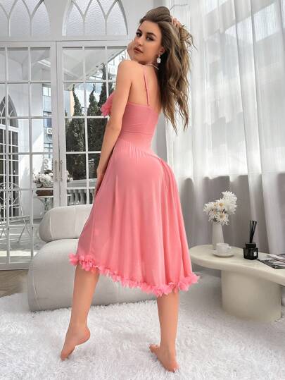 فستان نوم طويل بغطاء شبكي مزين بكشكشة