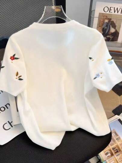 قميص قطني بطباعة زهرية مطرزة للنساء، رقبة طاقم للصيف