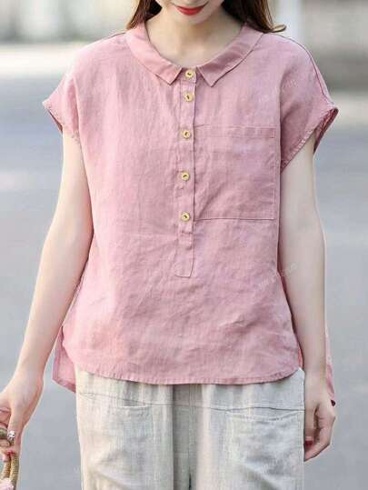 قميص كاجوال للنساء لون سادة، ياقة مفرودة، أزرار، أكمام قصيرة، طراز بسيط للاستخدام اليومي