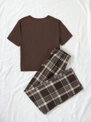 مجموعة بنطلون مربعات نسائي وقميص تي شيرت قصير الأكمام بلون واحد، ملابس منزلية عصرية