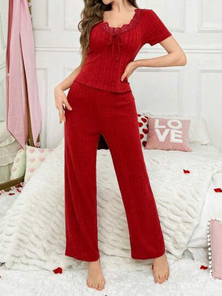 مجموعة بيجامات نسائية تتكون من ملابس علوية أكمام طويلة وبنطلون مصنوعة من قماش مخططات ريبي ذو فتحة رقبة على شكل حرف V، بنمط الدانتيل بتصميم ضيق