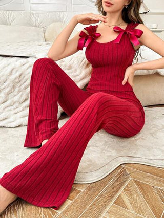 مجموعة بيجامات نسائية: فوطة واسعة مزينة بربطة شريط و بنطال ذو ساق متسع