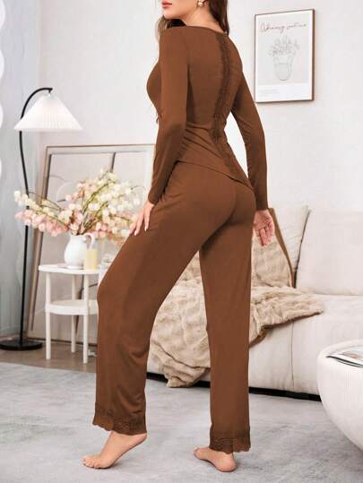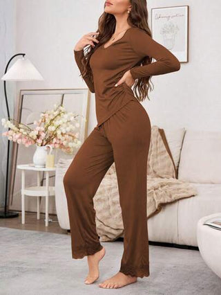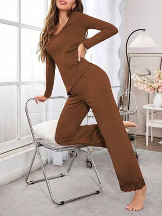 مجموعة بيجاما للنساء تتكون من سترة بياقة V والطويلة الأكمام وبنطلون من لون أحادي