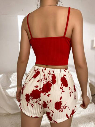 مجموعة بيجاما نسائية مكوّنة من سروال قصير بخصر مع شريط رباط وقميص كامي ربّى