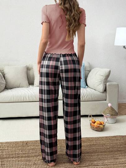 مجموعة بيجاما نسائية من قطعتين (قميص وبنطال) ذات طبعة مربعات وأكمام قصيرة، وذات لون أحادي