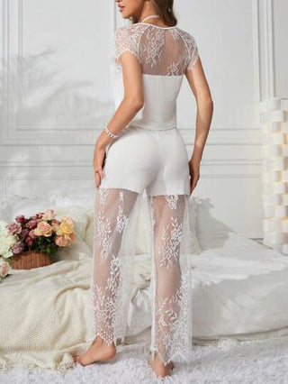 مجموعة بيجامة مكونة من ملابس علوية بأكمام قصيرة وياقة مستديرة وبنطلون مصنوعة من قطعات وردية البيضاء