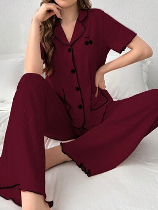 مجموعة بيجامة نسائية تتكون من ملابس علوية قصيرة الأكمام مطرزة بالكرز وسروال مع تفاصيل ملونة