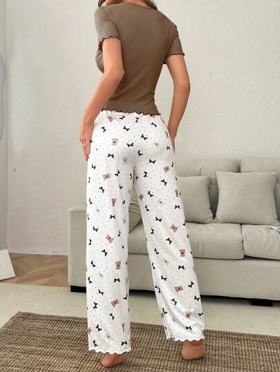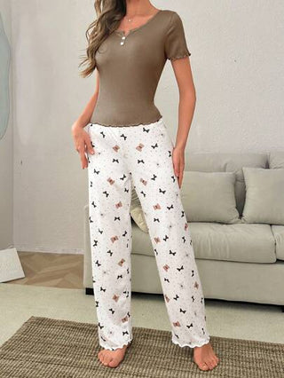مجموعة بيجامة نسائية من قطعتين، قميص أكمام قصيرة أزرار أمامية بلون واحد وبنطال طباعة دب برقعة نقطية