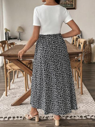 مجموعة فساتين حمل مريحة للنساء الحوامل 2 قطعة، تيشرت أحادي اللون مع تنورة على شكل A مزهرة النمط وأذيال مشقوقة