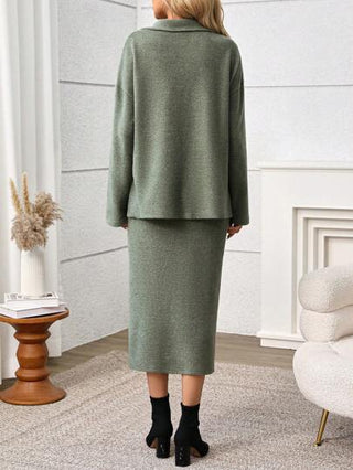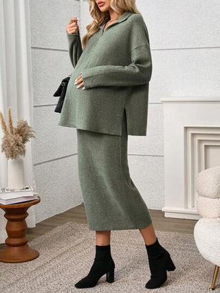 مجموعة من 2 قطعة للنساء الحوامل، بلوزة سحاب طويلة الأكمام القصيرة أسفل الكتف بياقة ملونة، وتنورة كتلة لون ضيقة قابلة للتعديل بالخصر، لون رمادي، للحمل