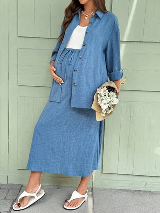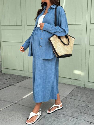مجموعتان من ملابس الحمل - بدلة من جاكيت أكمام طويلة وتنورة قصيرة باللون الأحادي، موضة صيفية