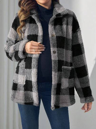 معطف فلانيل أنيق للنساء الحوامل بنمط مربعات باللونين الأسود والأبيض، ذو جيبين وأكمام منسدلة، جاكيت أنيقة مع أزرار، ملائم للاستخدام في فصل الشتاء