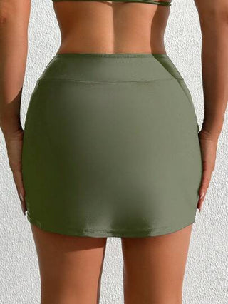 ملابس شاطئ للنساء: سباحة بتصميم فستان قصير أنيق مقسوم على الجانب و بنطال شاطئ لون سادة