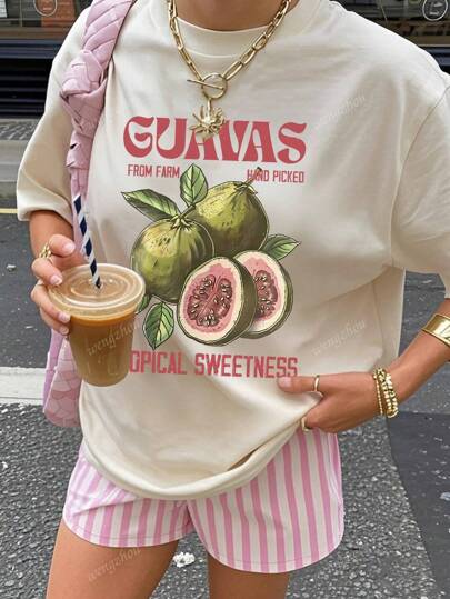 تي شيرت T نسائي كاجوال فضفاض ومريح بطبعات فاكهة، رقبة دائرية، قابل للتنفس، ملابس وقت الفراغ عصرية للربيع والصيف