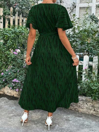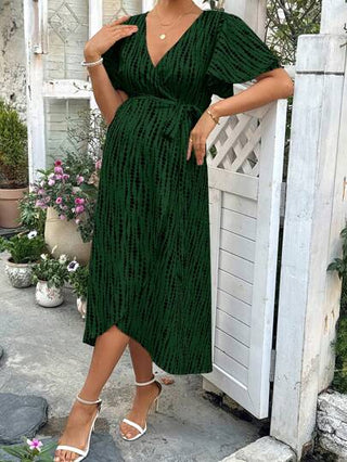 فستان أنيق للأمهات طويل النصف للحمل بطبعة زهرية وكشكشة في الأكمام بتصميم تعتيق اللون للاستخدام في الرحلات