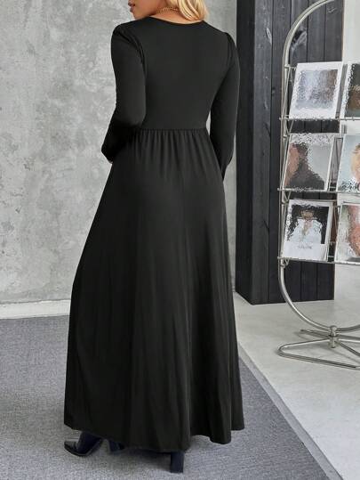 فستان أنيق للحمل بطقوس دانتيل متباينة وفتحة رقبة على شكل حرف V وذيل مشقوق للخريف