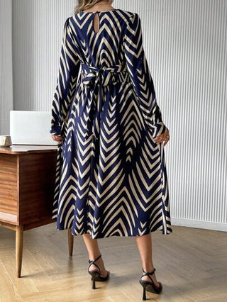 فستان أنيق ملائم للحمل كامل الطباعة بياقة دائرية وأكمام طويلة وتصميم تداخل الخصر، موسم الخريف