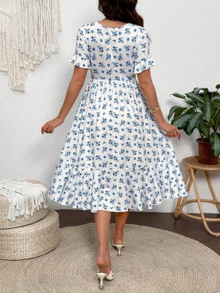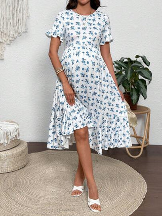 فستان حمل مطبوع بزهور برقبة دائرية وذيل مكشكش وأكمام قصيرة