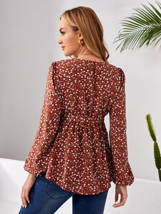 ، قميص بطبعة زهور دقيقة مزين بكشكشة مع حزام الأمومة، قميص بكشكشة الحاشية