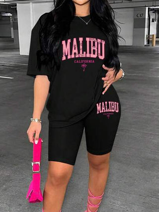 2 قطعة/مجموعة تيشيرت نسائي عاري الذراعين وسروال قصير برقبة دائرية مطبوع عليها حروف لعارضات الأزياء الصيفية