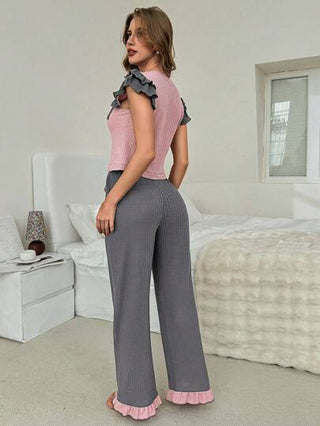 2 قطعة سراويل نسائية كاجوال بلون تباين وزخرفة كشكشة مع فيونكة ملابس منزلية