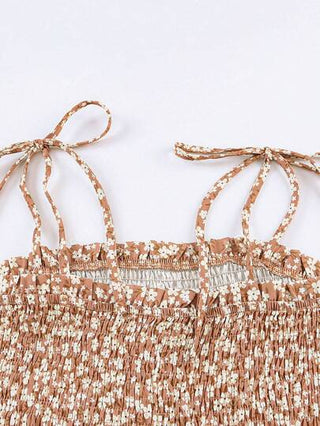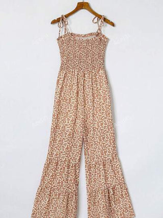 Acelitt إطلالة نسائية للصيف بأسلوب إجازة تتميز بأنها جمبسوت واسع الساق بنمط إكسسوارات علوية مع ألوان زهرية، متدلية من الخلف، من خشب