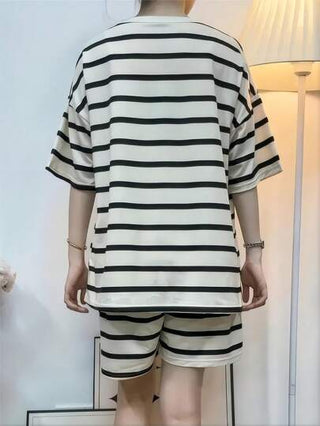 AICJ مجموعة كاجوال للنساء 2 قطعة، للربيع/الصيف، قميص بأكمام قصيرة مقلم وشورت مريح للارتداء في الداخل/الخارج، مجموعة قطعتين