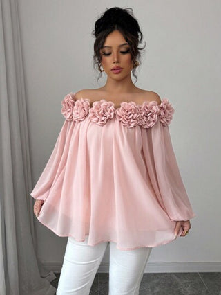Airlisse ملابس علوية نسائي أنيق أسفل الكتف من الشيفون،قماش أملس قصير بلون أحادي مع زخرفة زهرية ثلاثية الأبعاد،متعدد الاستخدامات للحياة اليومية والمواعيد والحفلات، بأكمام طويلة