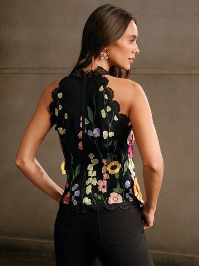 Anewsta بلوزة بدون أكمام أنيقة وناعمة للسيدات مع زهور ملونة ثلاثية الأبعاد، توب تي شيرت نسائي ذات أشكال جرافيكية
