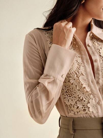 Anewsta بلوزة فضفاضة شفافة بياقة منقلبة مع تطريز دانتيل للنساء