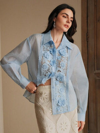 Anewsta بلوزة نسائية أنيقة رومانسية ذات لون بسيط مفرغة من الدانتيل ذات أكمام طويلة ، أزياء ربيعية لفصل الصيف