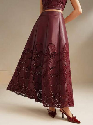 Anewsta تنورة خط A رقبة عميقة قصيرة مطرزة من جلد اصطناعي باللون الأحمر ، ملابس رمضان