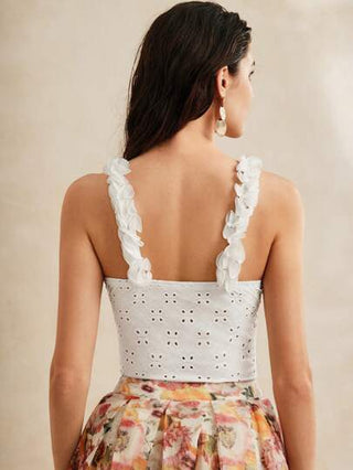 Anewsta توب أبيض قطني أكمام بلا أشرطة مزخرف بطرز ثلاثي الأبعاد بنقوش زهور للاستخدام اليومي والعطلات