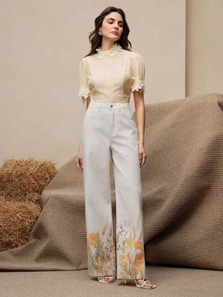 Anewsta سراويل جينز نسائية ذات ساق واسعة ومستقيمة مع طبعات