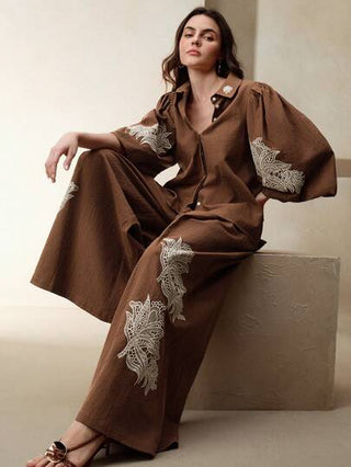 Anewsta ميلاني ملابس راقية مكونة من ملابس علوية كم منفوخ مطرزة وبنطلون ساق واسعة قطعتان للعطلات والمناسبات