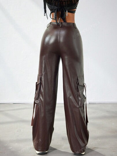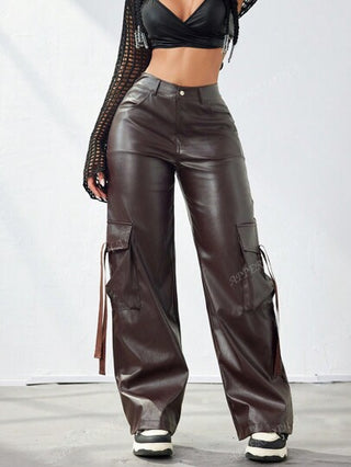 Apperloth A بنطلون كارجو جلد مستعمل واسع الساق مزين بشريط جانبي وجيب غطاء ماييار