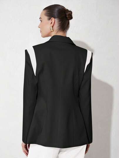 Aveloria Modichic بدلة جاكيت نسائي مزودة بكتف محشو، طويلة الأكمام ذات رقبة على شكل V، مصممة بطراز أفانغاردي بتباين لوني أسود وأزرق كلاسيكي، مناسبة للارتداء أثناء الذهاب والإياب إلى العمل