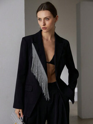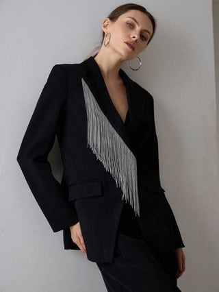 Aveloria Modichic معطف منفرد المصمم بياقة مدبب وتصميم شراشيب ملونة عصري، أكمام طويلة مناسب لحفلات العطلات المتعددة الاستخدامات