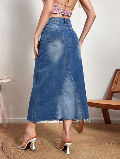 Breezaya تنورة طويلة من الدنيم للنساء مع حاشية مهترئة
