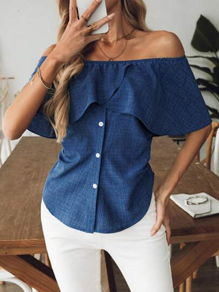 Calvaya بلوزة كتف واحد، كشكشة, بلا أكمام، بتأثير الجينز الأزرق، خصر مؤنث، أنيقة وجذابة