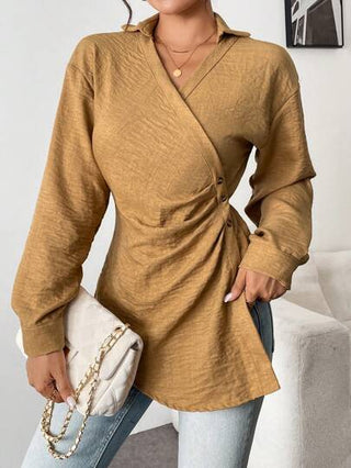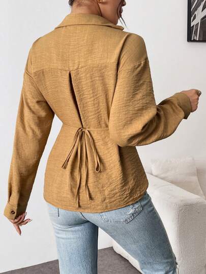 Calvaya قميص أسيمتري الذيل متوسط الطول بأكمام طويلة، ذو لون واحد كاجوال، خريفي
