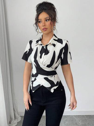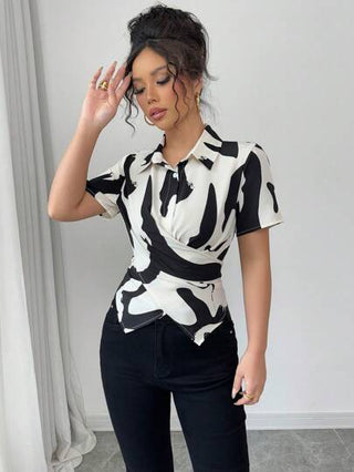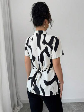 Calvaya قميص بلوزة أنيق للنساء مطبوع بطباعة هندسية مع أكمام قصيرة