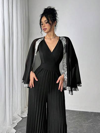 Calvaya بدلة سهرة أنيقة وأنثوية طويلة الأكمام مع ياقة على شكل حرف V مرصعة بالترتر قطعة واحدة
