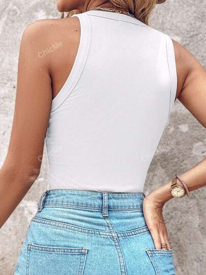ChicMe حمالة منسوجة بياقة على شكل حرف O، بدون أكمام، خامة بايبات، تناسب الجسم، تحكم في البطن، ملابس علوية كاجوال