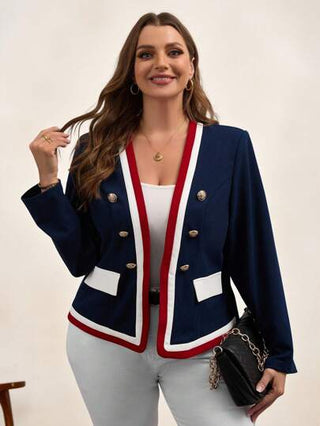 Chikora بدلة رسمية انيقة بياقة على شكل V مع خطوط ، أكمام طويلة مزدوجة الصدر وجيوب، بدلة عادية للعمل للسيدات الممتلئات