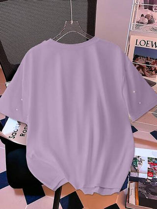 Chiquease تي شيرت أبيض قصير الأكمام ذو رقبة مستديرة مرصع باللؤلؤ ، أنيق، موضة الصيف
