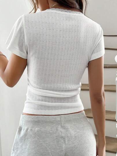 Chiquease تي شيرت نسائي كاجوال أبيض ضيق مع أكمام قصيرة مخرم بتصميم دانتيل حلو